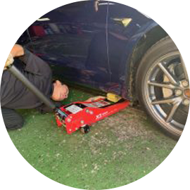 さまざまな車種のジャッキポイントを見極め、ウエスをあてがい変形しないよう確実にジャッキアップ。