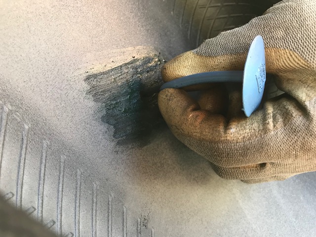 この時、穴の部分も成型し、セメント接着剤とともに補修材のヒゲの部分が穴に入り穴をふさぎます。
