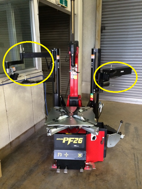 通称Sタイヤと呼ばれるレースなどで使用されるタイヤや公道で使用できないレーシングタイヤ。このSタイヤも交換作業にコツがいります。通常のタイヤと交換作業自体は変わりないのですが、タイヤチェンジャーやサポートアームなどの調整がシビアになってきます。(黄色で囲った部分がサポートアームです)