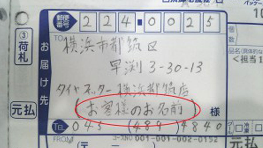 多数のお客様が直送されておりますので、どのお客様のタイヤか判断できるよう、注文時にお届け先欄に、お名前とお電話番号の記入をお願いいたします。(左画像を参考にお名前を入れていただければ結構です)